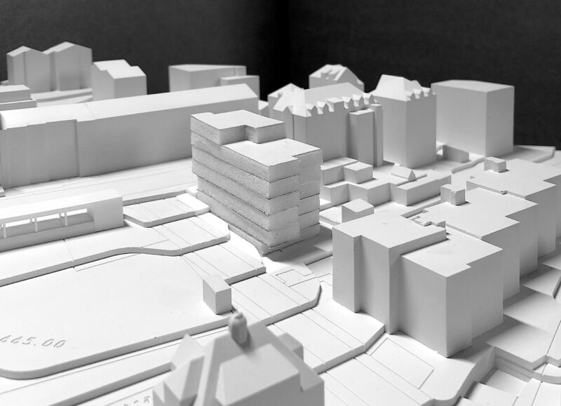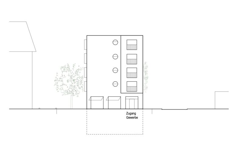 Im Erdgeschoss an der Langgasse ist ein überhoher Gewerberaum vorgesehen, der auch von dieser Seite adressiert wird. Der Erker in den Obergeschossen funktioniert gleichzeitig als Vordach für den Eingang zum Gewerberaum.