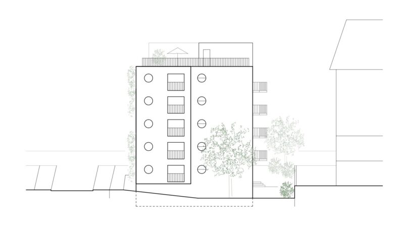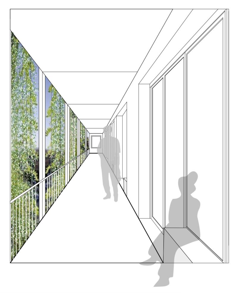 Die Wohnungen sind über einen begrünten Laubengang erschlossen, der leicht übertief ausformuliert ist, so dass er auch als Begegnungszone genutzt werden kann. Der Laubengang dient gleichzeitig an beiden Enden als Balkon.