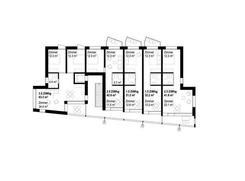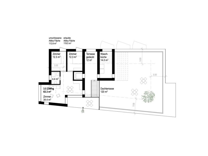 Die Waschküche ist im obersten Geschoss platziert und die daran angegliederte, grosszügige Dachterrasse ist somit für alle BewohnerInnen zugänglich.