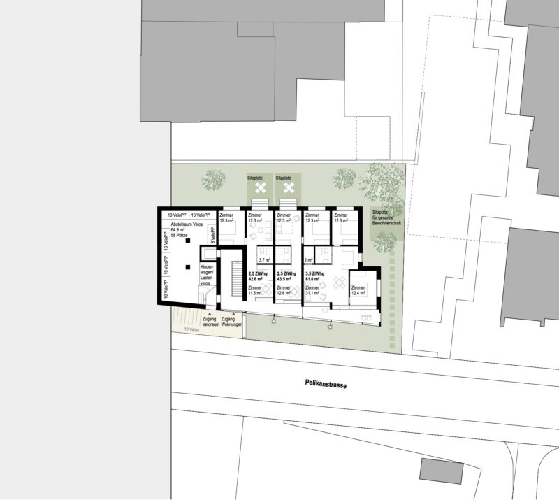 Der Zugang zu den 22 Klein-Wohnungen einschliesslich der Velo-Parkierung ist auf der Seite der Pelikanstrasse positioniert und funktioniert unabhängig von der Gewerbenutzung, da er ein Geschoss tiefer im Sockelgeschoss liegt.